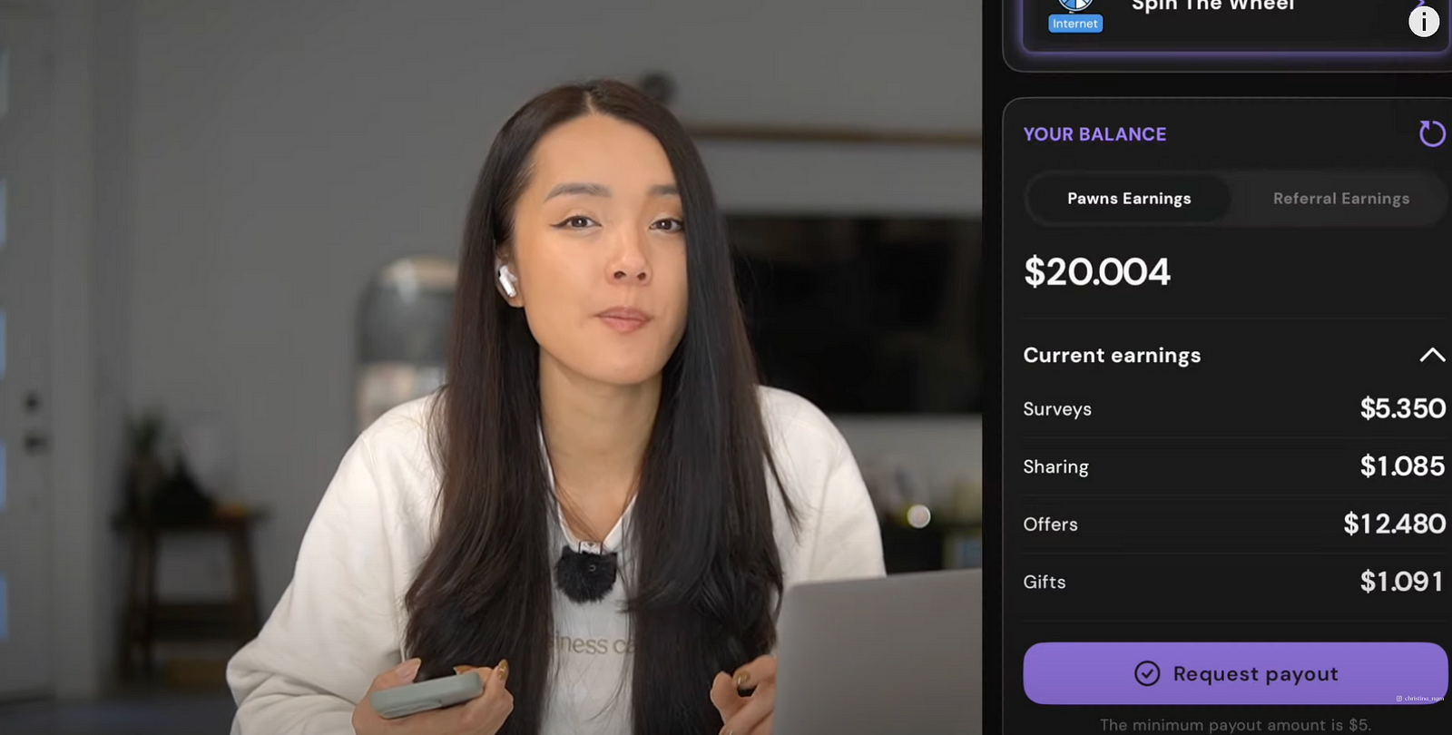 The most passive (and personally, my favorite) feature, internet sharing, allows you to earn money by letting Pawns use your unused internet bandwidth for tasks like market research. It’s unobtrusive and runs in the background while you go about your day. Pawns pays $0.20 per gigabyte of bandwidth shared, with potential earnings dependent on factors like internet speed and your location.