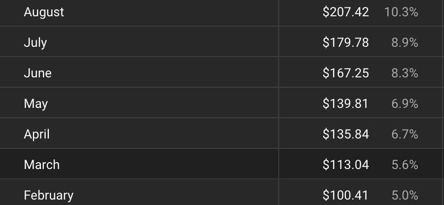 For the next few months — March, April, and May — my earnings remained in the lower hundreds, fluctuating between 9,000 and 10,000 views. June marked a turning point with a noticeable spike. The CPM (Cost Per Thousand Impressions) reached $30, and I earned $167.25 with increased views. July and August saw steady growth, breaking the $200 mark in August with about 14,000 views.