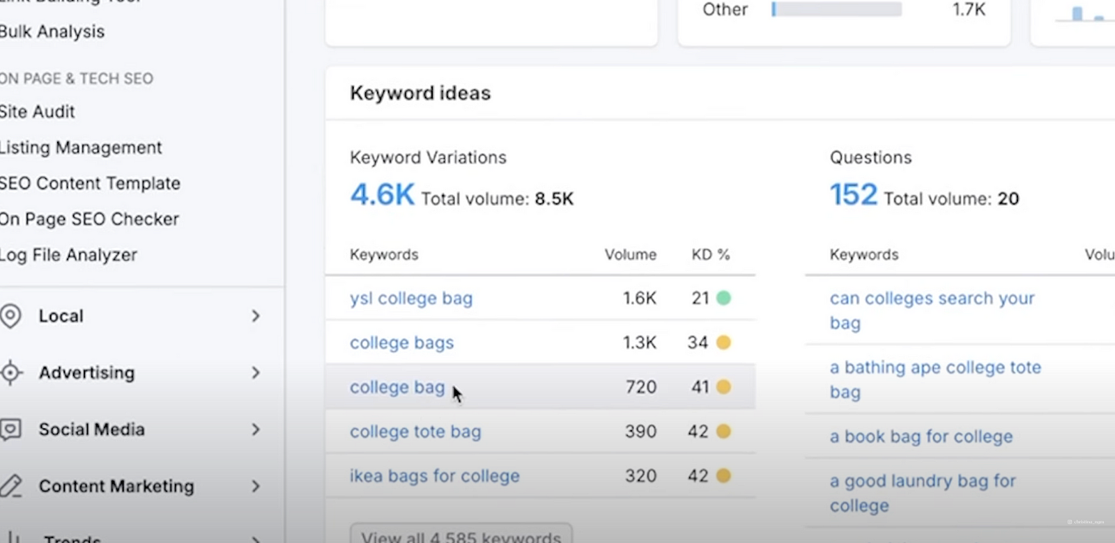 Since I’m creating this at the end of August, the back-to-school season is in full swing, and “college bags” caught my attention. To narrow down further, use long-tail keywords. My go-to tool for this is SEMrush, which helps find specific variations like: