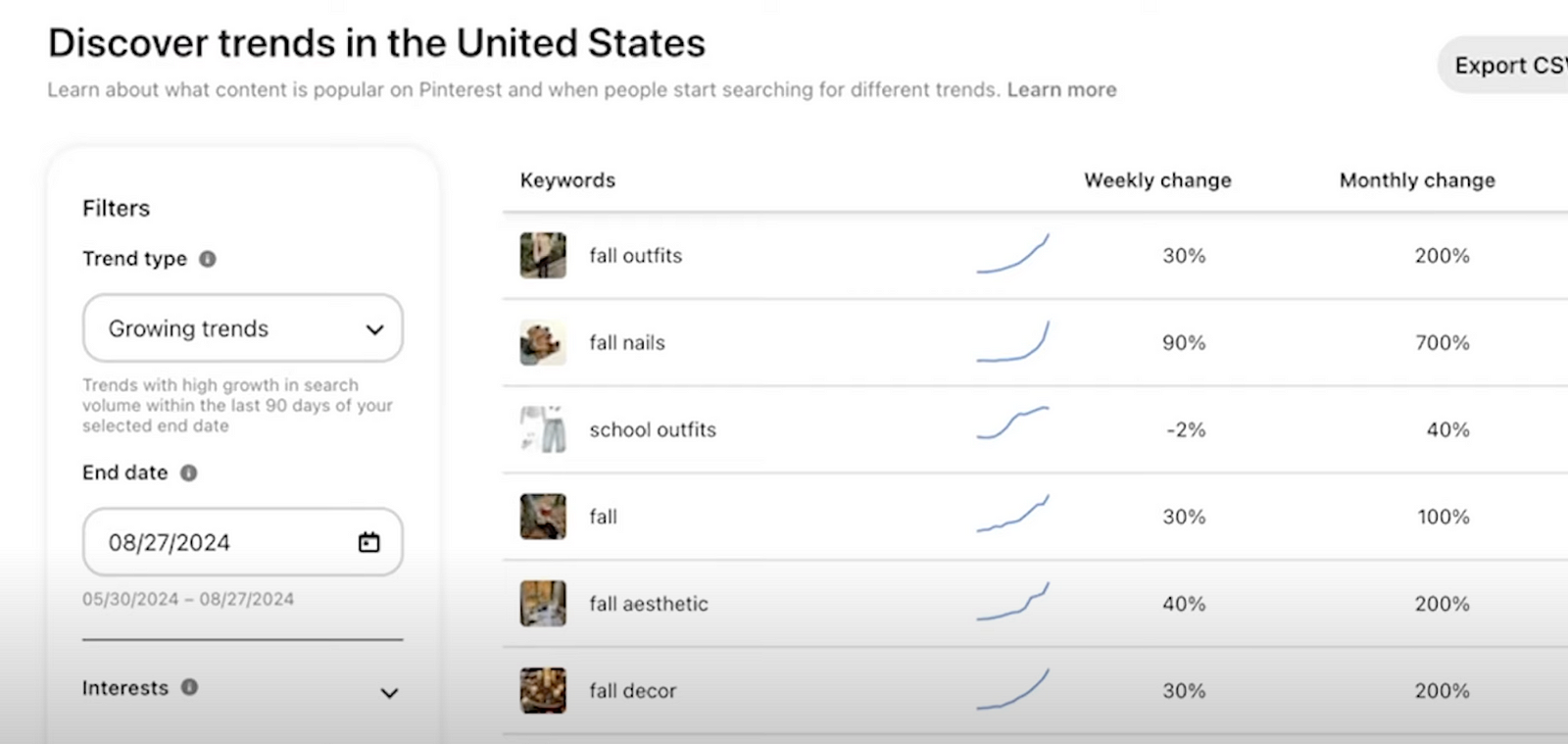 To start, research what people are searching for on Pinterest. Instead of picking a niche upfront, work backward by identifying trends. A great tool for this is Pinterest Trends, available with a professional account.