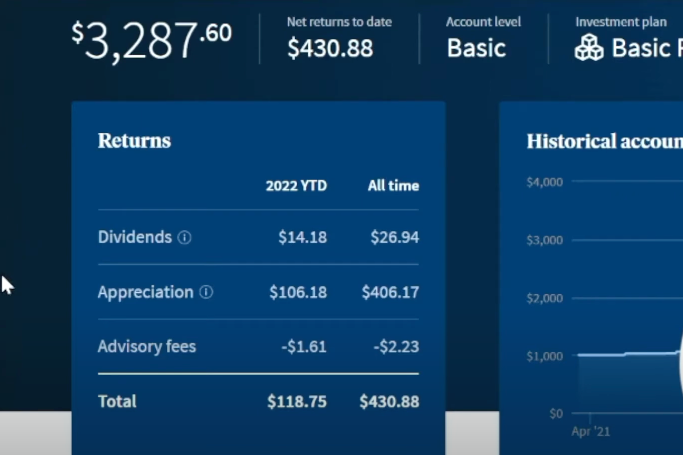 Initially, I invested $20 per week, but eventually, I increased it to $40. Now, I’m investing about $160 monthly. As of today, my portfolio is worth close to $3,300 — a steady increase from my last update. This total reflects my original investments, the IPO, recurring deposits, appreciation, and dividends, minus advisory fees.