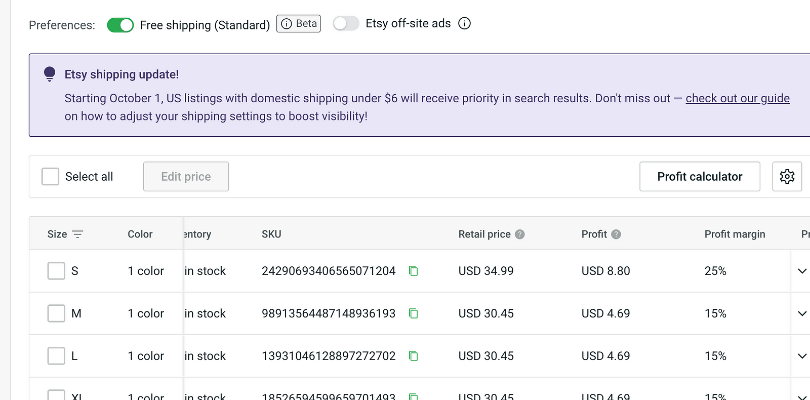 One of Printify’s most useful features is the pricing tool. It calculates your profit margins based on production costs, Etsy fees, and shipping. I decided to offer free shipping, as this often influences purchasing decisions. After adjusting my price to $34.99, my profit margin was around 25%, or $8 per sale — decent for a passive income stream.